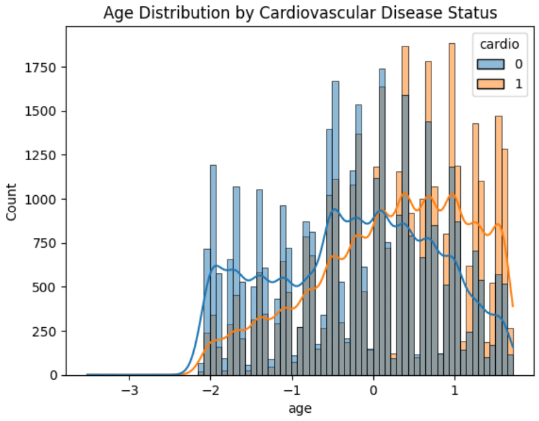 This data summary provides a comprehensive overview of various health metrics associated with CVD risks in 70,000 individuals, making it a valuable resource for predictive modeling and medical research. Each variable in the database consists of 70,000 records, verifying a complete data set with no missing values in any of the columns. Most variables are standardized (mean close to 0, standard deviation close to 1), which simplifies many statistical analyzes by putting different variables on the same scale. Standard deviation (std) gives values close to 1 for standardized measurements indicating normalization, which adjusts the data to have zero mean and unit variance, useful for models that assume normally distributed data. Chart 1 shows the age distribution by cardiovascular disease status. Detailed attribute analysis Age is standardized with a mean close to 0. The original age values represent days, but here they are transformed to a scale useful for statistical modeling. Gender is coded as 1 or 2, indicating male and female gender respectively. A mean of 1.35 suggests a greater proportion of one gender than the other. Height and weight are standardized. Blood pressure (systolic and diastolic) shows some extreme peak values, indicating potential outliers or input errors. Cholesterol and glucose are categorical variables ranging from 1 to 3, indicating levels. Mean values closer to 1 suggest that lower levels are more common in the dataset, but there is sufficient variation to analyze their impact on cardiovascular health. Cigarettes, alcohol, and activity are binary lifestyle variables (0 or 1) show different averages, with "activity" being the most common (average near 0.80) and "alcohol" consumption relatively infrequent (average around 0.05). This distribution provides a good basis for investigating the effects of lifestyle on health. The target variable for the presence of CVD, with a mean value of nearly 50%, indicates a balanced dataset with an equal number of positive and negative cases, ideal for training predictive models without the need for class-balancing sampling techniques. (Graph 1)