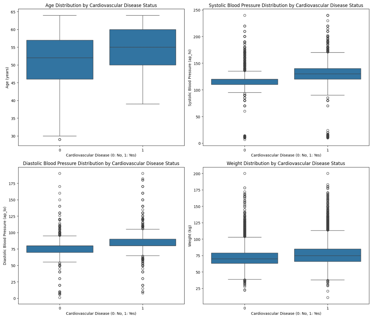 Univariate analysis: It is important to note that these plots provide a univariate comparison between two groups.9 Graph 2 shows four box plots comparing the distribution of age, systolic blood pressure, diastolic blood pressure, and weight in two groups: those without cardiovascular disease (CVD) labeled “0” and those with CVD labeled “1”. Individuals with CVD tend to be older than those without. The age range is wider in those with CVD, indicating greater variability in age in this group. There are outliers in both groups, indicating the presence of individuals who are much younger or older than the majority in each group. The mean systolic blood pressure is higher in people with CVD, and the IQR is also wider, indicating both higher mean levels and greater variability in systolic blood pressure in those with the disease. There are many outliers in both groups, especially in the group without cardiovascular disease, where some individuals have extremely high systolic blood pressure readings. Similar to systolic blood pressure, individuals with CVD have slightly higher mean diastolic blood pressure and a wider IQR. Outliers are present in both groups, with some individuals having particularly high diastolic blood pressure readings. Mean weight appears similar between the two groups, suggesting that weight alone may not be a discriminating factor for CVD in this dataset. There is a wider IQR for the CVD group, indicating greater variability in weight among these individuals. Exceptions in the distribution of weight are visible in both groups, especially in some individuals who have very high weights. In addition, outliers should be investigated to ensure data quality and understand potential impact on analysis results.