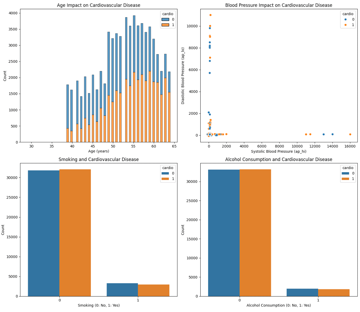 Bivariate analysis: Graph 3 shows several visualizations to illustrate how age, blood pressure, and lifestyle factors such as smoking and alcohol consumption affect the prevalence of cardiovascular disease. An increase in the number of cases of cardiovascular diseases is noticeable as the age increases. This indicates a strong correlation between age and the likelihood of developing cardiovascular problems.10 Higher blood pressure readings are more often associated with the presence of cardiovascular disease. The impact of smoking seems relatively small, so both smokers and nonsmokers show cases of cardiovascular disease. Similar to smoking, alcohol consumption does not show a strong correlation with a higher prevalence of cardiovascular disease in this database. Both drinkers and non-drinkers show cardiovascular disease, with non-drinkers showing a slightly higher incidence. Systolic blood pressure tends to be higher in people diagnosed with cardiovascular disease in all age categories, mean blood pressure is consistently higher in the group with cardiovascular disease, especially noticeable in older age groups.