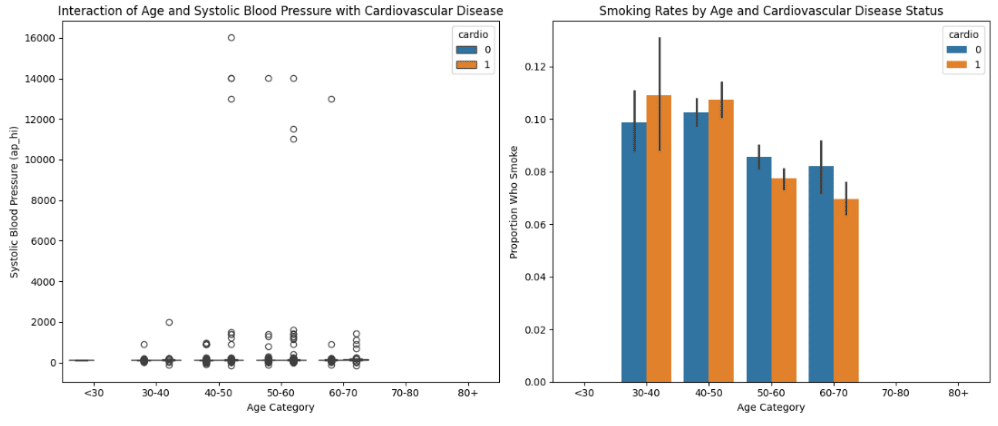The right graph shows the interaction of smoking rate by age and cardiovascular disease status. The percentage of smokers appears to decrease with age, with the youngest category (<30) having the highest percentage of smokers and the oldest (80+) having the lowest. For most age categories, the proportion of smokers is slightly higher for those without CVD compared to those with CVD, although the error bars (representing the variability or standard error) suggest that these differences may not be statistically significant. It is interesting to note that smoking is usually associated with an increased risk of CVD, but the visualization seems to suggest that in this dataset, smokers are either underrepresented among patients with CVD or there may be other confounding factors affecting the relationship between smoking and CVD.