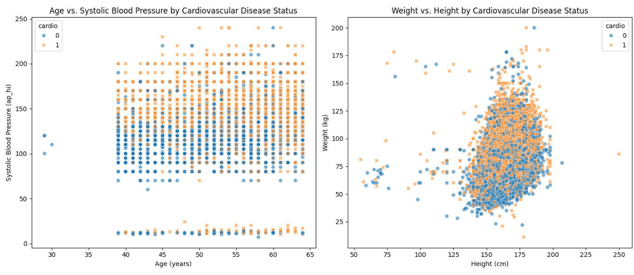 Both graphs reveal distributions and relationships that are consistent with known health patterns, but they also illustrate the complexity of the relationships between these factors and CVD.