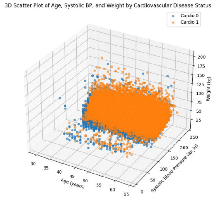 3D plots reinforce the multifactorial nature of cardiovascular disease and the importance of considering a range of physiological and possibly non-physiological factors in risk assessment. Graph 6 shows a 3D scatterplot visualizing the relationship between age, systolic blood pressure (BP) and weight in relation to cardiovascular disease (CVD) status. Each data point represents an individual in the database, with the position along the axes indicating their age, systolic blood pressure, and weight. Age is shown on the horizontal plane starting at approximately 30 years and extending to approximately 65 years. There does not appear to be a clear division between individuals with and without CVD based on age alone. There is a significant concentration of high systolic blood pressure in individuals with CVD, particularly as age increases, which is consistent with the medical understanding that high blood pressure is a risk factor for heart disease. Similar to weight and age, there is a mix of individuals with and without CVD across the weight spectrum, however, there is a small concentration of individuals with more severe CVD. Individuals with CVD tend to have higher systolic blood pressure and possibly heavier weight, although weight has a more even distribution. There is considerable overlap between the two groups, suggesting that although there may be trends in blood pressure and weight associated with CVD, there is no distinct separation based on these factors alone. Clustering of points, especially in the middle ranges of weight and blood pressure, indicates common physiological ranges where most individuals fall. There appear to be no extreme outliers in this visualization, indicating relatively normal ranges for age, weight, and systolic blood pressure for this population.