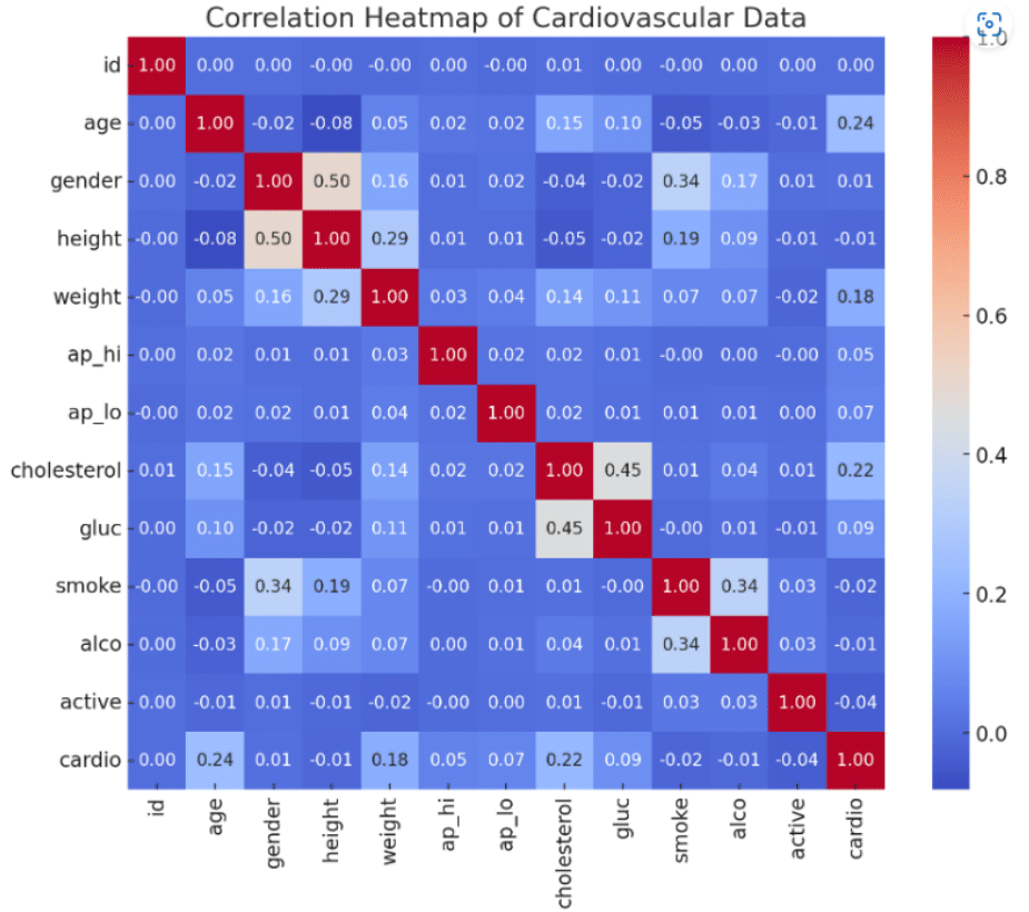 There is a modest positive correlation (0.24) between age and the presence of cardiovascular disease (CVD), suggesting that as age increases, so does the likelihood of CVD. The moderate positive correlation (0.34) indicates that in this dataset, one gender may be more likely to smoke than the other. The strong positive correlation (0.50) suggests a significant difference in height between the sexes. A positive correlation (0.22) means that higher cholesterol levels are associated with a higher likelihood of CVD. The positive correlation between glucose and cholesterol levels (0.45) indicates that higher cholesterol levels often coincide with higher glucose levels, which may indicate underlying metabolic syndromes. The positive correlation between cigarettes and alcohol (0.34) may suggest that smokers are more likely to consume alcohol compared to nonsmokers in the data set. The remaining values are close to zero, indicating very weak correlations.