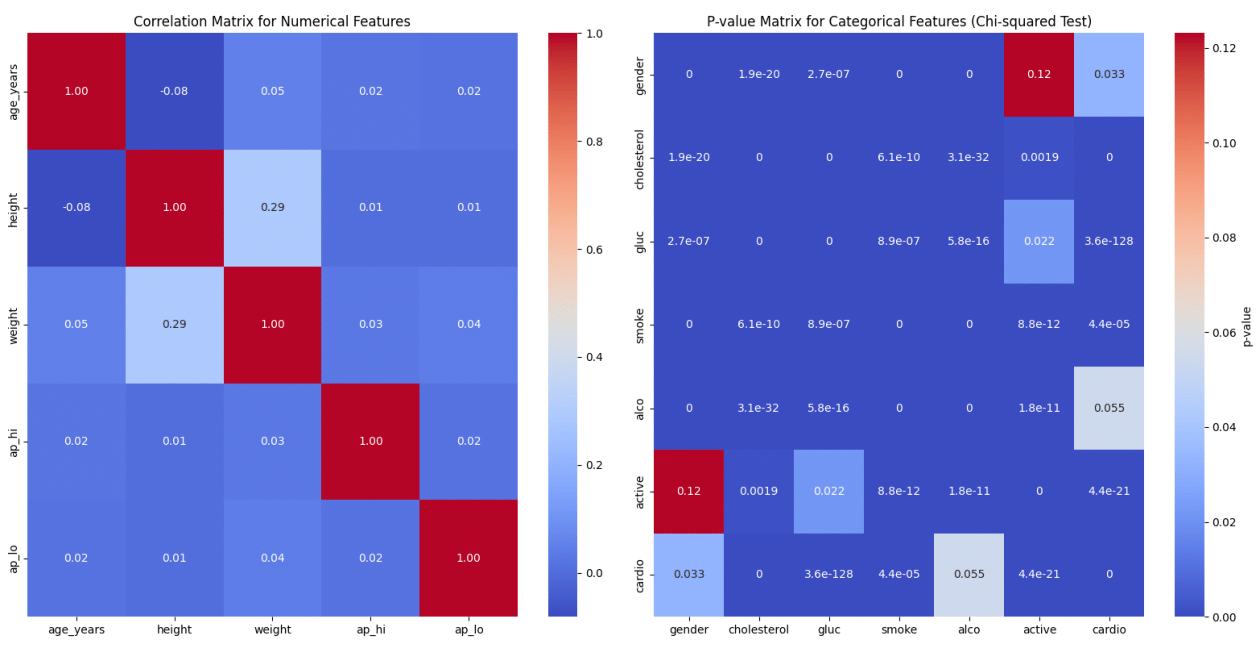The numerical correlation matrix shows that among the numerical characteristics studied, only height and weight have a moderate relationship. The P-value matrix shows statistically significant associations between all tested categorical variables and cardiovascular disease, confirming that factors such as cholesterol, glucose level, smoking, alcohol consumption, and physical activity have a strong association with cardiovascular health. The strength of these associations is consistent with current medical knowledge, which links lifestyle factors and biochemical markers to cardiovascular disease risk. Statistical significance does not imply causality, and these associations will need to be further investigated with controlled studies to discern causality and effect sizes.