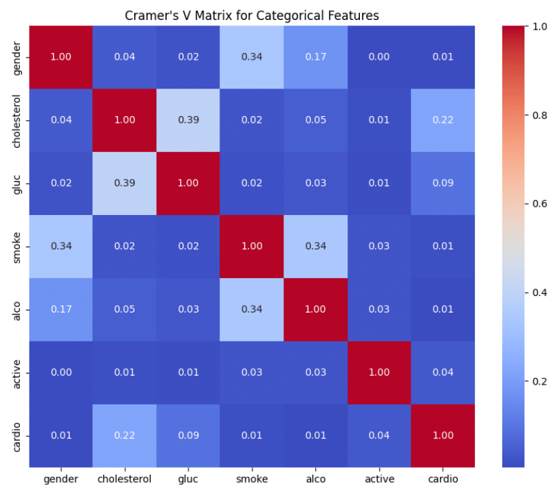 Kramer's matrix V indicates some moderate relationships between lifestyle factors (smoking and alcohol consumption) and gender, and between metabolic indicators (cholesterol and glucose levels). Associations between these categorical factors and the presence of cardiovascular disease are weak according to this matrix, which may suggest that a multivariate approach considering the interaction of multiple factors may provide more insight into the complex nature of cardiovascular disease risk.