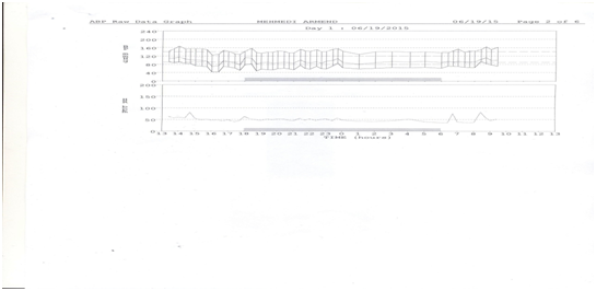 The 21 years old male comes in our clinic with high blood pressure and symptoms of headache and rarely nosebleeds. One year ago his doctor measure his blood pressure 240/110mmHg and prescribe antihypertensive therapy beta blockers and, ace inhibitors. In the beginning his blood pressure was reduce but not control and after 6-7 months he stopped to receive antihypertensive therapy. On the time of hospitalisaton his blood pressure was 170/100 mmHg on both arms, with simulating palpation of radial and femoral pulse we found radio femoral pulse delay and no palpabile collaterals on his back. We done ECG - without signs of left ventricular hypertrophy and ABMP (Figure 3) with results of 24h high blood pressure.