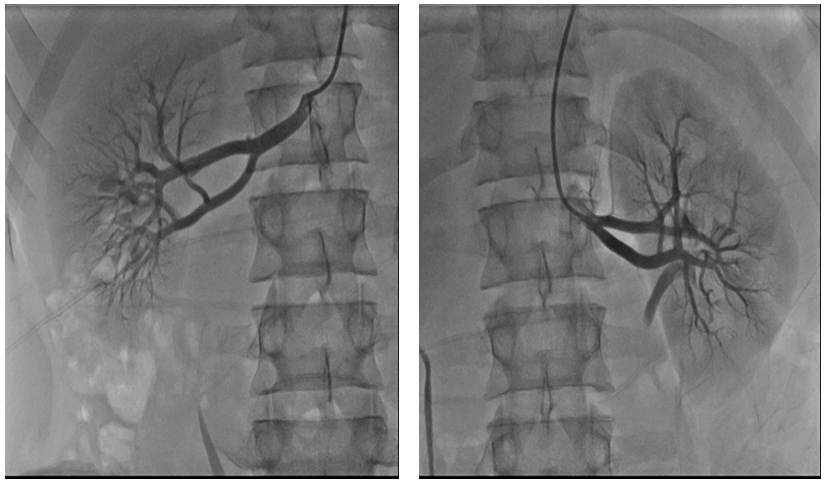 Echocardiography showed normal left ventricular dimension with moderate left ventricular hypertrophy, IVS-13mm, ZZ -11mm, and the high pressure gradient (56mmHg) by Doppler echocardiography at the across stenotic segment. This finding make a suspicion of coarctation of aorta and we done aortography (Figure 4) which confirm the diagnosis of juxtaductal coarctation. The renal angiography (Figure 5) was normal. The computed tomography (KT) aorta (Figure 6) showed juxtaductal coarctationwith high stenosis 77%-80% and prominent a.mamaria internal with collateral vessels across inferior epigastric, intercostal and scapular artery.