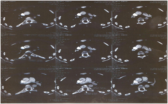 In our case the diagnosis of CoA is made after hypertension is noted as an incidental finding during evaluation of hypertension with presenting symptoms of headaches. Many patients are asymptomatic during the childhood as our patient except for the incidentally noted hypertension [5]. The diagnosis of coarctation of the aorta may not be recognized by the physician if it is not think about secondary form of hypertension. It is necessary to palpation of femoral pulses and measurement of blood pressure during routine examination and non-invasive pressure difference >20 mmHg between upper and lower limbs help to confirm the diagnosis of CoA In adults simultaneous palpation of femoral and radial pulsus and radiofemoral pulse delay are clinical features for CoA, as in our case. Echocardiography provides information especially sign of left ventricular hypertrophy and high pressure gradient with Doppler evaluation on the stenosis site of thoracic aorta. Angiography are still gold standard for the evaluation of this condition and KT and MR preferred non invasive techniques for evaluate aorta in adults. When the diagnosis of CoA is comfirm the surgical and interventional treatment with balloon angioplasty and implantation stent are treatment options [6,7]. In our patient with criterium of presence of hypertension and with >50% aortic narrowing relative to the aortic diameter on KT the intervention was recommended [8].