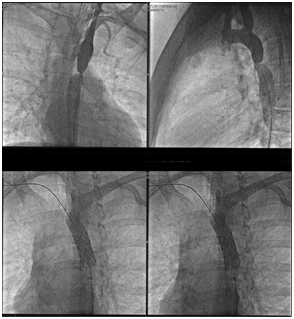 She decided to undergo a balloon angioplasty, motivated by the perspective of a shorter hospitalization time and better recovery. She underwent the procedure in September 2015 with the insertion of an endoprosthesis (Figure 1). After the procedure, she remained hospitalized for 1 day and resting for 5days after discharge. After 10 days, she was able to work and, after 3weeks, she was fully recovered and able to exert physical activity. Her blood pressure was controlled with Atenolol 50mg/day for 3months and she took Aspirin 100mg/day for 6months following the procedure. After one-year, she underwent an angio CT, which showed adequate function of the endoprosthesis, and an echocardiogram which showed normal cardiac function, an adequate aortic gradient of 12mmHg and no valvar nor myocardial abnormalities.