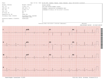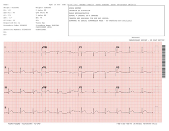 The first ECG recording on presentation showed a 1mm ST segment elevation in the inferior leads and V5-V6 (Figure 1). The serial ECGs after, showed resolution of ST segment elevation with no other ST-T wave changes (Figure 2). By the time she was referred to the cardiology on call, there was no indication for thrombolysis as she was pain free and her ECG was not showing STEMI, which is why she was started on conservative management as a case of aborted inferior STEMI.