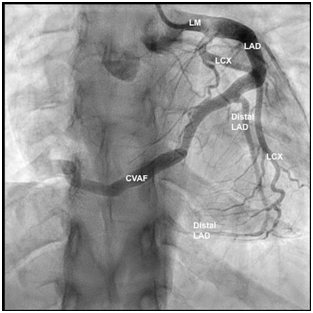 Multiple cases were reported of CAVF. Darawzah et al.,8 published the case of a 51-year-old gentleman with multiple comorbidities, presenting to the emergency department with typical chest pain associating with sweating and nausea who was later diagnosed as anterior myocardial infarction. During angioplasty, a fistula originating from the circumflex artery and terminating into the pulmonary artery.8