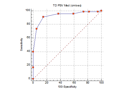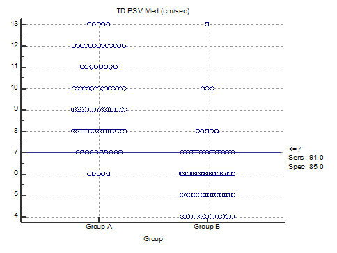 Figure 6 Interactive dot diagram for the cut-off point between normal and abnormal EF as regard to TD PSV (Sm) at the Medial Mitral annulus.