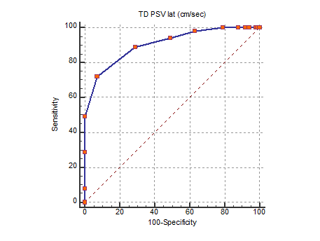 The ROC curve and Interactive dot diagramof MAPSE at the medial mitral annulus showed that the optimal cut off value for detecting subnormal LVEF (LVEF<50%) was ≤ 7mm with sensitivity of 73% and specificity of 100% (Figures 1 & 2), (Table 3). The ROC curve and Interactive dot diagram of MAPSE at the lateral Mitral annulus showed that the optimal cut off value for detecting subnormal EF (LVEF<50%) was ≤ 10mm with sensitivity of 82% and specificity of 93% (Figures 3 & 4), (Table 3). The ROC curve and Interactive dot diagram of TD PSV (Sm) at the medial and lateral Mitral annuli showed that the optimal cut off value for detecting subnormal EF (LVEF<50%) was ≤ 7cm/sec with sensitivity of 91% and specificity of 85% for the medial annulus (Figures 5 & 6), (Table 3), and with sensitivity of 72% and specificity of 93% for the lateral mitral annulus (Figures 7 & 8), (Table 3). When the cut-off values of both parameters (Mitral annular TD PSV and MAPSE) were combined for detecting subnormal (LVEF<50%) , the sensitivity and specificity increased to 95.9% and 100 % respectively for the medial Mitral annulus and 85.5% and 97.7% respectively for the lateral Mitral annulus (Tables 4 & 5).
