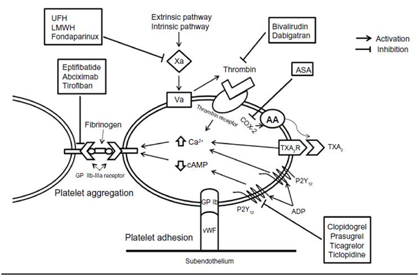Abbreviations: AA, Arachidonic Acid; COX-2, Cyclo-Oxygenase-2; CAMP, Cyclic Adenosine Monophosphate; ADP, Adenosine Diphosphate; ASA, Aspirin; UFH, Unfractionated Heparin; LMWH, low molecular weight heparin; TXA2, thromboxane A2; GP, glycoprotein; VWF, von willebrand factor; TXA2R, thromboxane A2 receptor