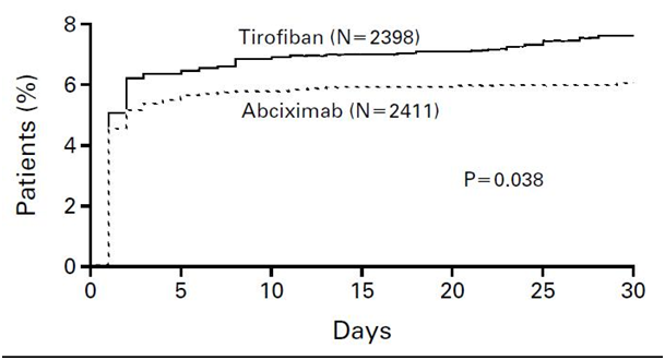 Incidence of the Primary End Point, a Composite of Death, Nonfatal Myocardial Infarction, or Urgent Target-Vessel Revascularization, in the First 30 Days after Enrollment. After 30 days, the incidence of the primary end point was 7.6 percent in the tirofiban group and 6.0 percent in the abciximab group (hazard ratio, 1.26; 95 percent confidence interval, 1.01 to 1.57; P=0.038).