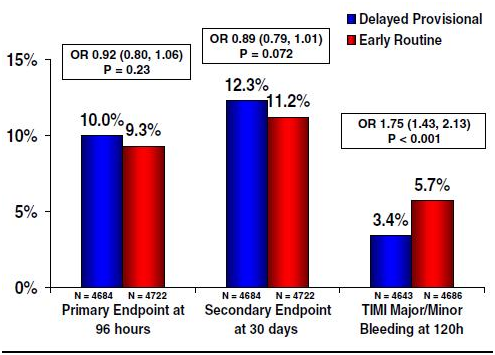 Rates of the primary efficacy composite end point (death, myocardial infarction, recurrent ischemia leading to urgent revascularization, or thrombotic bailout) at 96 h, key secondary efficacy composite (death or myocardial infarction) at 30 days, and the primary safety end point (TIMI major bleeding) are shown for a delayed, provisional use of eptifibatide just prior to percutaneous coronary intervention (blue) versus the routine early administration of eptifibatide (red). OR: odds ratio.