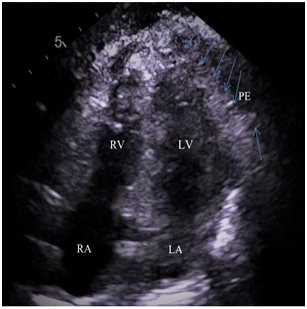Figure 2 2Dimension -4 Chamber apical view- showed air swirling (blue arrows) along with pericardial effusion (PE) in the pericardial cavity.
