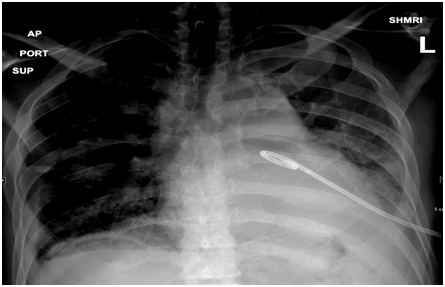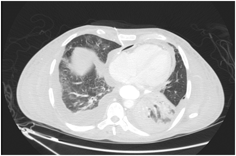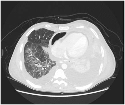 Figure 5 Post Pericardiocentesis CT axial view (LUNG WINDOW) shows pig tail in situ at pericardium with marked improvement.