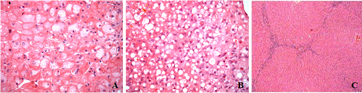 Figure 1 Photomicrograph of rabbit liver after 3months of dieting showing (A) ballooning hepatocytes; (B) – steatosis - Hematoxylin and Eosin - 400x and (C) interlobular septa - Hematoxylin and Eosin - 100x.