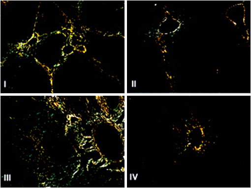 The liver was stained by picrosirius and analyzed with polarized light microscopy, verifying the formation of complete and incomplete interlobular septa (Figure 2). Changes histopathological findings were presented due to hypercholesterolemia, independent of the presence or absence of hyperglycemia. There was no significant difference regarding of the steatosis, between groups (Table 2). By histomorphometry, performed sections stained with picro-sirius polarized light the area with collagen, lesser degree of fibrosis found in the groups treated with ACEI compared with untreated groups, independent of blood glucose of these animals, although statistically significant difference was observed only in the group with glycemic control (group IV) (Figure 3).