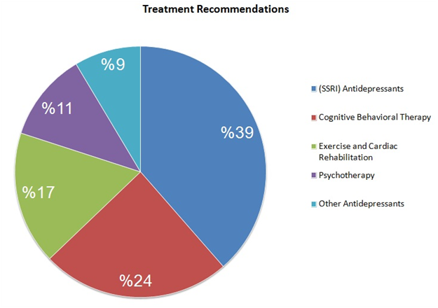 Doctors' preferences and recommendations on the best treatment option were as follows: SSRIs Antidepressants, Cognitive Behavioral Therapy, Exercise and Cardiac Rehabilitation, Psychotherapy, then Other Antidepressants (Table 2 and Figure 3).