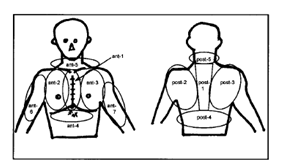 *The following anatomical areas are shown in the figure above: ant -1: Median full sternotomy wound; ant 2-3: Intercostals region; ant -4: Epigastrium or drainage extubation; ant -5: Ant .neck region, or central vein drip extubation; ant 6-7: Upper arm region; post -1: Vertebral region; post 2-3: Acrominal process & scapular region; post-4: Lumber region; post-5: Posterior neck region.