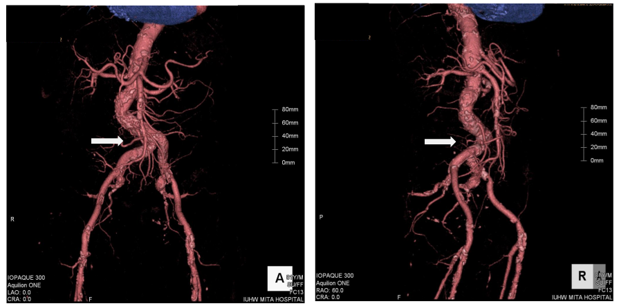 Figure 1 Three-dimensional image from enhanced computed tomography. The white arrows indicate significant tortuosity of the right common iliac artery. Left: antero-posterior projection. Right: right anterior-oblique projection.