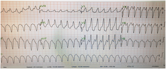 The chest x-ray showed cardiomegaly with pulmonary oedema. He was admitted to the ICU. An urgent echocardiography showed dilated left ventricle with severe LV systolic dysfunction, grade III diastolic dysfunction, moderate MR and normal RV function and size. He was kept on amiodarone infusion and IV fluids as maintenance. His repeated K was 6.7 mmol/L. Initial impression was metabolic acidosis/hyperkalemia with acute kidney injury secondary to hypovolemia and low cardiac output. The VT secondary to acidosis and hyperkalemia. He received anti-hyperkalemic measures and sodium bicarbonate to correct his acidosis and hyperkalemia. He was started empirically on ceftriaxone after sending septic workup. In view of hypotension he was started on nor-adrenaline and dobutamine. Unfortunately, he developed recurrent VT required multiple DC shocks and received total of 500 mg IV boluses of lidocaine and 2g of Magnesium sulfate along with amiodarone infusion.