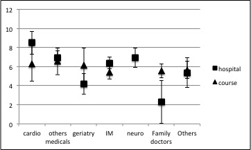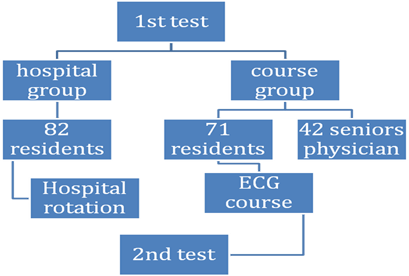 Methods: Participants were included prospectively and divided into two groups for analysis: Hospital Group (82 residents during their Cardiology rotation) and Course Group (71 residents and 41 staff physicians from the audience to a specific electrocardiogram course). They fill in 2 different questionnaires of 10 basic electrocardiograms: “Initial Test” at the beginning and “Final Test” at the end. We assign one point for each correct answer and zero for incorrect one (score range was 0 to 10 points).