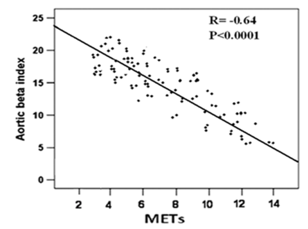 Correlation analysis before and after PCI, showed that METs was inversely correlated with age (-r= 0.31, P<0.05; -r = 0.28, P < 0.05), peak S (P < 0.02), E’ mean (P <0.01 &<0.03), LAVI (P< 0.01 & <0.001) , E/E′ ratio (-r = 0.55 & 0.53, P < 0.001), and ASI (r =0.61& 0.64, P < 0.001) (Table 4). On the other hand E/E’ was significantly correlated with LAVI ml/m2 (r=0.58& 0.62; P<0.001), and aortic beta index (r =0.61& 0.64, P < 0.001), (Table 5). With multiple regression analysis, ASI emerged to be the strongest independent predictor of improved exercise indices and decreased E/E’ after PCI (Table 6 & 7).