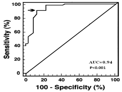 Receiver operating characteristic curve analysis showed that ASI <15 was the best cut off value for the prediction of improved exercise tolerance (increased METs), with a sensitivity, specificity, positive predictive value and negative predictive value of (95%, 64%, 94% and 70% respectively). The area under the curve was 0.93 (0.873-0.985) (Figure 4). While the best cut-off value in predicting decreased LV filling pressure (significantly decreased E/E’) was <16.5, with a sensitivity, specificity, positive predictive value and negative predictive value of (96%, 63%, 95% and 68% respectively). The AUROC was calculated as 0.94 (0.872–0.992) (Figure 5).