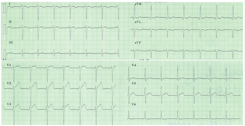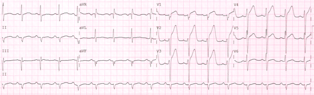 Figure 1 Resting electrocardiogram of Case 1, demonstrating sinus rhythm with ST segment elevation in anterior wall and probable inactive electrical zone in inferior wall.