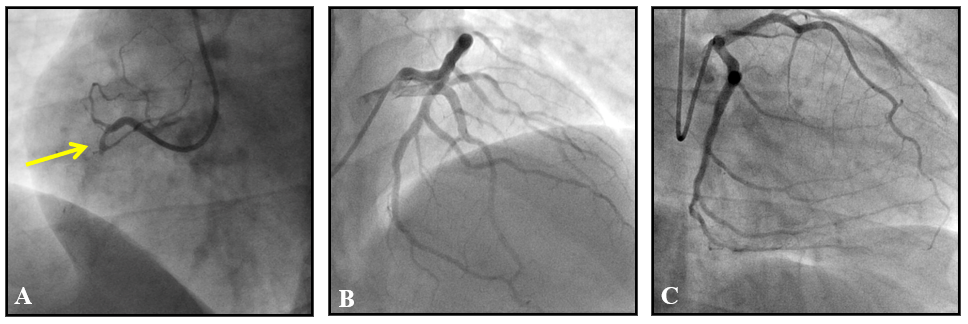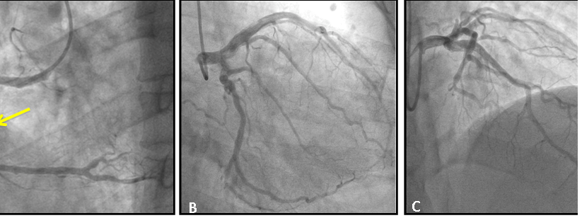 Figure 5 (A) right coronary angiography in left oblique projection demonstrating total occlusion of the non-dominant right coronary in its proximal portion (arrow); (B) left coronary angiography in direct cranial projection demonstrating mild obstructive lesion in diagonal branch; (C) left coronary angiography in right obliquous projection demonstrating dominant circumflex branch with mild obstructive lesion in its proximal portion.