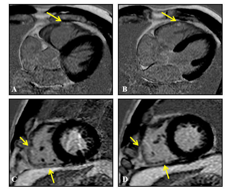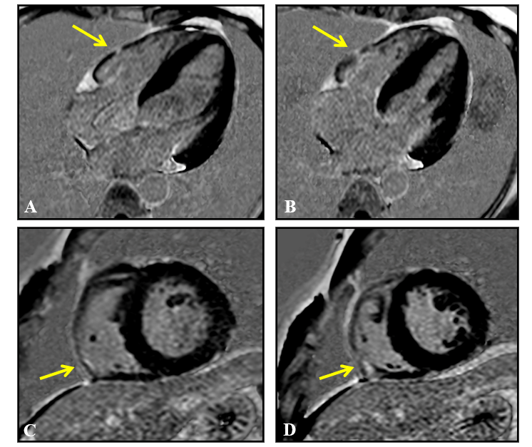 Figure 6 Cardiac magnetic resonance imaging, late gadolinium enhancement sequences, 4 chambers (A and B) and short axis (C and D), showing areas of pathological late enhancement in the myocardium of the inferior-lateral segment of the right ventricular free wall (arrows), without associated left ventricular involvement.
