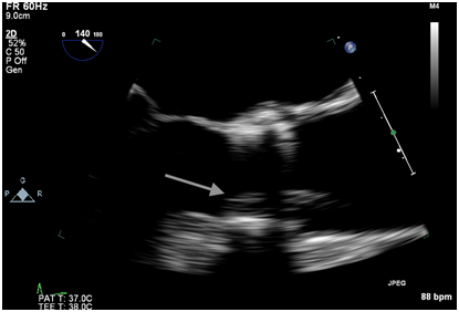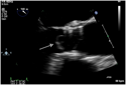 Figure 1B Intraoperative TEE post valve deployment showing an echodensity attached to the ventricular side of the strut along the right coronary cusp protruding into the left ventricular outflow tract.