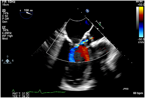 Figure 1A Intraoperative TEE post valve deployment showing the echodensity prolapsing across the valve prosthesis into the aorta.