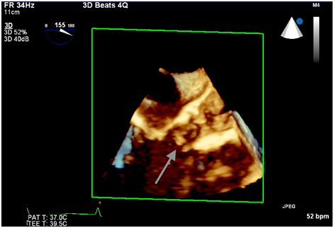 There was a debate whether the echo density represented acute valve thrombosis vs an avulsed native valve leaflet. We believed the former to be less likely given the patient’s pre treatment with DAPT and objective evidence of adequate intraprocedural anticoagulation. However, the patient was transferred to the intensive care unit for continuous monitoring. Anticoagulation with warfarin was initiated. Her hospital course was uneventful and she was discharged to home after 5 days. There was no change in the size of the echo density or severity of aortic regurgitation on pre-discharge TEE. The decision was made to treat the patient with 3 months of anticoagulation with DAPT and warfarin. Follow up TEE at 3 months revealed a persistent mobile echo density, unchanged in appearance from the intraprocedural TEE, confirmed by 3D echo cardio graphic reconstruction (Figure 3). The patient continued to be symptom free and was advised to remain on daily aspirin and warfarin. Clopidogrel was discontinued.