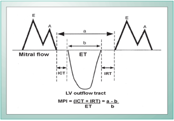 Doppler time intervals were measured from mitral inflow and LV outflow velocity. Tei index was measured by Doppler echocardiography by the same previously discussed manner in patients after 3 months (Figure 1).
