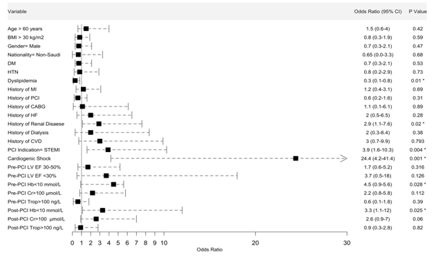 The association between certain predicators from the previous tables and the major adverse cardiac events (MACE) are illustrated in Table 3. We have identified previous renal disease, PCI indication, cardiogenic shock, pre and post procedural haemoglobin level, pre-procedural as well as post-procedural creatinine level to be associated significantly with increased in hospital MACE. It was counterintuitive to find an inverse relationship between dyslipidaemia and increased MACE. Figure 1 shows the odds ratio of these predictors and significance relationship using logistic regression testing.