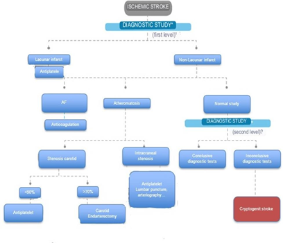 This protocol refers to those patients who have suffered an episode of acute cerebral ischemia, in the form of established stroke or TIA (transient ischemic attack), classified as cryptogenic stroke, that is, those patients in whom after performing a complete etiological study (Figure 1), it is not possible to establish the exact etiology of the stroke.