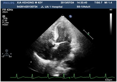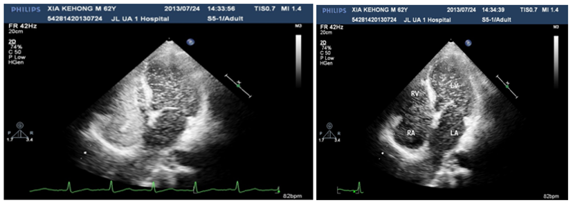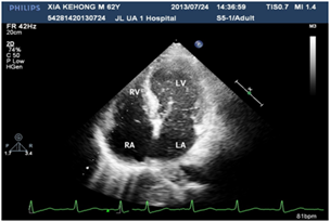A 60years old male, known case of diabetes mellitus, hypertension and alcoholic hepatic cirrhosis had exercise induced chest discomfot, shortness of breath, fatigue and lips cyanosis half a year ago, which relieved at rest. But later he became serious for one week and visited our department for further management. He had no cough, fever, dizziness, headache or bleeding history from any site. He had pituitary adenoma, which was surgically removed 6years ago. He denies history of chronic infections such as tuberculosis or actinomycosis or family history of hereditary hemorrhagic telangiectasis (HHT). Physical examination revealed cyanosis of the face and lips, clubbing, numerous spider naevi on neck, chest and palm and no telangiectasia on mucosa or fundi. His blood pressure was 130/80mmHg, heart rate was 76beats/min and resting oxygen saturation was 66% in room air. A grade 1/6 soft systolic murmur was heard on the upper left sternal border and clear lungs sound. There were no bruits. The hemoglobin was 11.5gm/dL and the hematocrite was 35.5gm/dL. Arterial blood gas analysis showed Pao2 64mmHg on room air and after 100% of oxygen 74mmHg with Paco2 41mmHg and PH-7.35. Chest radiography and electrocardiogram did not show any abnormalities. Pulmonary function test showed alveolar dispersion function severely reduced. Transthoracic echocardiography showed normal findings (No PFO/ASD/VSD/PDA detected). We performed contrast echocardiography using agitated saline. A delayed appearance of a substantial amount of micro-bubbles in the left atrium greater than three cardiac cycles after appearance in the right atrium and ventricle (Figure 1) which was suggestive of pulmonary arteriovenous fistula. The delayed appearance and a large amount of micro-bubbles in the left atrium preclude the intracardiac shunting resulting from a patent foramen ovale (PFO) or arterial septal defect (ASD). Interestingly, the density of micro-bubbles was the same in the left and right cardiac chamber even after 10 cardiac cycles (Figure 2 & 3) and when the injection stopped, there were micro-bubbles in the left cardiac chambers meanwhile none in the right cardiac chambers (Figure 4). Because the hepatic function of the patient was in compensatory period, we gave him oxygen-inhalation and beta-blockers in order to decrease the oxygen demands and to lower the portal vein pressure. Moreover, he was advised to avoid sudden standing. The cyanosis improved, and the patient was discharged from the hospital and on regular follow-up. The patient was advised for pulmonary angiography but refused.