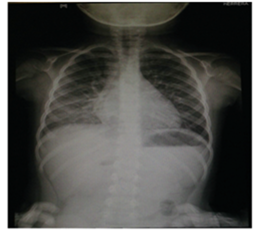 Considering the previous signs and laboratory parameters; treatment was started with antibiotic ceftriaxone 50 mg/kg and requirement fluid therapy; she evolved with cardiopulmonary deterioration; with persistent desaturation with 100% inspired oxygen, increased respiratory effort and sinusal tachycardia; we performed endotracheal intubation followed by clinical deterioration with hypotension, bradycardia and cardiac arrest; we started advance CPR, during the maneuvers she developed ventricular arrhythmias, fibrillation with no response to treatment and no return to spontaneous circulation, declaring time of death 10:00 in the morning. An autopsy was performed and reported the presence of a pulmonary thrombosis and an atrioventricular intracavitary thrombi (Figure 2 & 3).