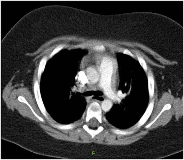 D-dimer was sevenfold the upper limit. A second chest radiograph showed a mild left pleural effusion. Because P.E. was suspected the patient underwent a contrast enhanced computed tomography (CT) of the thorax that demonstrated clots into the upper and lower lobar right pulmonary arteries (Figure 1). The girl was treated with LMWH followed by warfarin with resolution of symptoms. Further laboratory tests for thrombophilia screening revealed methylene tetrahydrofolate reductase heterozygotes mutation with normal homocysteine plasma level and heterozygotes mutation of the Factor II (G20210A). The patient was discharged from hospital on oral anticoagulant therapy for six months and with a hypo-caloric diet.