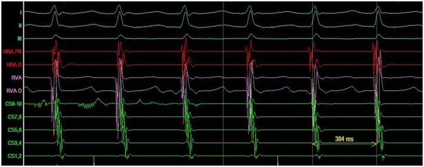 Electrophysiological study: I, II, III- ECG leads; HRA- high right atrium; RVA- right ventricular apex; D- distal electrode, PR- proximal electrode; CS- coronary sinus.