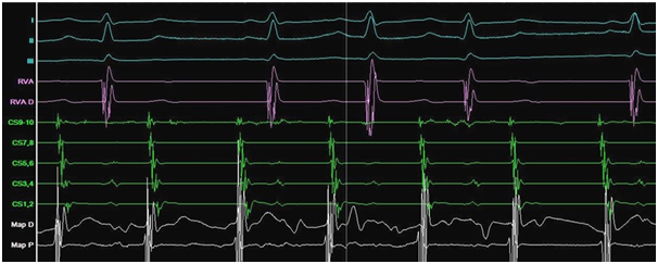 Electrophysiological study: I, II, III- ECG leads; RVA- Right ventricular apex; CS- coronary sinus; P- proximal electrodes; D- distal electrodes; Map- mapping catheter.