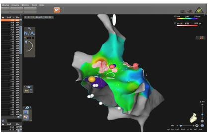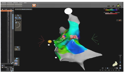Carto mapping detected 2 foci of AT origin: crista terminalis and right atrial anterior septum (Figure 3). These two foci were ablated and were non-inducible at the end of the procedure. The patient was further discharged with a recommendation to continue treatment with atenolol 12.5mg once daily. She was then followed-up for 18 months after the ablation in our outpatient clinic. No SVT was detected in repeated continuous Holter monitoring during the follow-up period. The patient reported no palpitations; moreover, resolution of anosmia and significant improvement of urinary incontinence occurred immediately after the ablation and ever since.