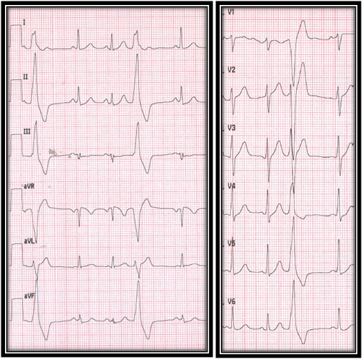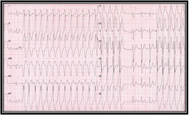 Figure 1: Widex QRS complex tachyarrhythmia. AV dissociation with AV relation ˂ 1, and onset QRS to peak in lead DII > 50 mseg was observed, supporting the diagnosis of VT.