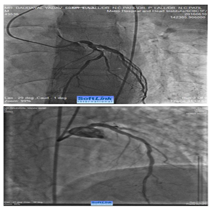 From 1st July 2015 to 30th June 2016, a total of 2,256 coronary angioplasties were performed in our center. Rotational atherectomy was done in 181 patients; 82 patients were more than 75 years old age and 24 patients were more than 80 years of age. Out of 82 patients, 59 patients were 'no-option' CAD patients where the patients had undergone one or two bypass graft surgeries and were unfit for another surgery. A number of them had associated comorbidites like chronic obstructive airway disease ('bad lungs'), chronic renal failure. In these patients the balloon angioplasty was not possible and aggressive medical treatment failed to relieve the intractable angina. Common indications of RA were calcified lesions, critical left main disease with bifurcation, diffuse disease and ostial lesions. However, RA was also performed for traditional contraindications to RA such as SVG lesions, acute myocardial infarction (calcified lesions with thrombus) and in-stent restenosis. Complications with RA included slow flow in several patients due to heavily calcified long lesions and were rectified with combination of intra coronary Dilzem and NTG. Burr entrapment happened in one case which was rectified by taking the whole system out which was dealt with covered stent. Non paralytic stroke happened in one patient with spontaneous recovery. All patients had uneventful recovery and were discharged 3-5 days later. On follow-up (ranging from 2-13 months) majority of patients are asymptomatic; however, 3 patients still complain of occasional Class II effort angina. Our experience highlights the fact that ‘rota-stenting’ is technically useful in difficult-to-treat patients with severe forms of coronary artery disease associated with comorbidities (unpublished data) (Figures 1-4).
