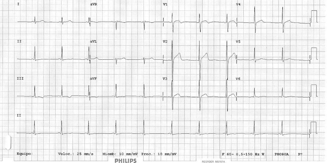 Here, we show to readers so much the clinical description as ECG recording of a male who have the previously mentioned association.He is 42 year-old male, unmarried, occasional smoker, arterial hypertension in treatment with felodipine (5 mgrs/day) and ramipril (5 mgrs/day), who was diagnosed of unstable angina (Prinzmetal’sAngor).He was immediately hospitalized because the patient had commented an intense, oppressive and progressive chest pain without relation with the physical effort. The pain was radiating towards both jaws. It was accompaniedof a great vegetativesymptom.