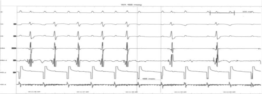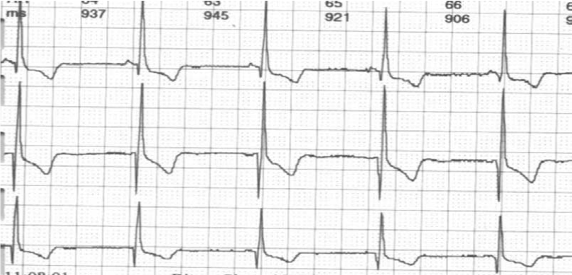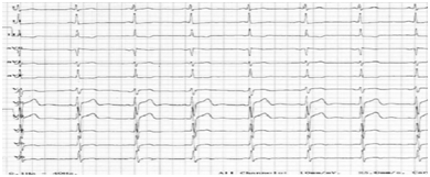 A 37-year-old man with many nocturnal tachycardia crisis (since childhood) and three syncopal events observed and related with physical stress. In his family background, two sudden deaths were found: father died at age 55 yearsfor sudden cardiac and a brother died at 22 months by sudden infant death. He was diagnosed in his Reference Hospital (where he was transferred by emergency services) with supraventricular tachycardia to 195-200 beats per minute(Figure 2), with narrow QRS complexes. Severe diaphoresis, with paleness of skin and mucosa. A severe arterial hypotension to 90/50 mm. Hg. Cardiac auscultation was in normal ranges but with a rapid rhythm. Tachypnea to20 cycles/minute. A grade Stuporous (Glasgow 15/15). The neurological examination was within normal ranges without focalizations. Central and peripheral pulses were palpable, symmetric and synchronous in "frecuens". Supraventricular tachycardia disappeared by means of the administration of two doses of Adenosine i.v. in bolus, with six mgrs. each one in 1 minute (Figure 3). A Hospital discharge was made after full stabilizing of acute process and patient was derived to your cardiologist outpatient, with the follow diagnosis: